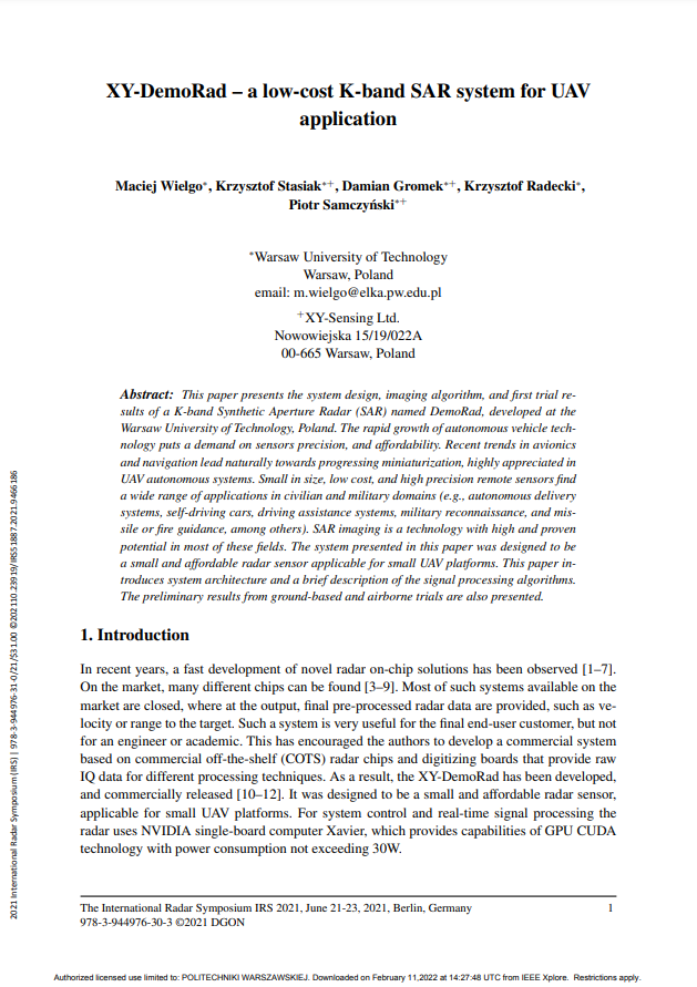 Maciej Wielgo, Damian Gromek, Piotr Samczyński, Krzysztof Stasiak, Karol Abratkiewicz, Marek Gaweł, „Low- Cost High-Resolution SAR Imaging on Drone“, the paper submitted for the publication in Proc. of the 2021 CIE International Conference on Radar, Haikou Hainan, China, 2021