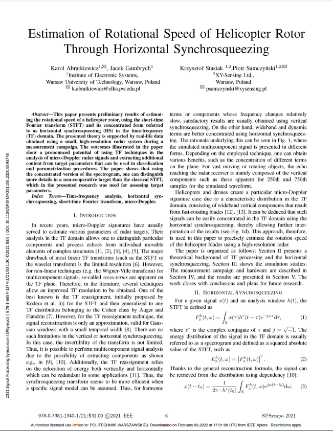 K. Abratkiewicz, P. Samczyński, „Multitaper Time-Frequency Reassigned Spectrogram in Micro-Doppler Radar Signal Analysis“ in 2021 Signal Processing Symposium (SPSympo), Łódź, Poland, 2021